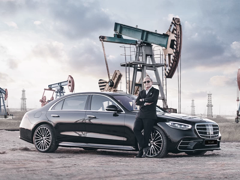 Burada çəkilən fotolarda 3 dəyərin vəhdət yaratdığını görə bilərik. Bir tərəfdə fəaliyyəti ilə daim avtomobil sənayesini zənginləşdirən “Mercedes-Benz”, fonda Azərbaycanı zənginləşdirən neft quyuları, digər tərəfdə “Neft və milyonlar səltənətində” filmi ilə başlayan milli kinomuzu öz təkrarolunmaz rolları ilə zənginləşdirən Fəxrəddin Manafov.