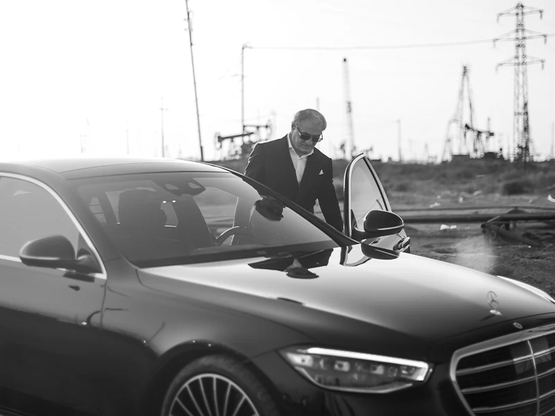 Burada çəkilən fotolarda 3 dəyərin vəhdət yaratdığını görə bilərik. Bir tərəfdə fəaliyyəti ilə daim avtomobil sənayesini zənginləşdirən “Mercedes-Benz”, fonda Azərbaycanı zənginləşdirən neft quyuları, digər tərəfdə “Neft və milyonlar səltənətində” filmi ilə başlayan milli kinomuzu öz təkrarolunmaz rolları ilə zənginləşdirən Fəxrəddin Manafov.